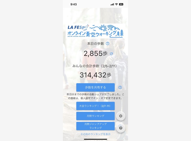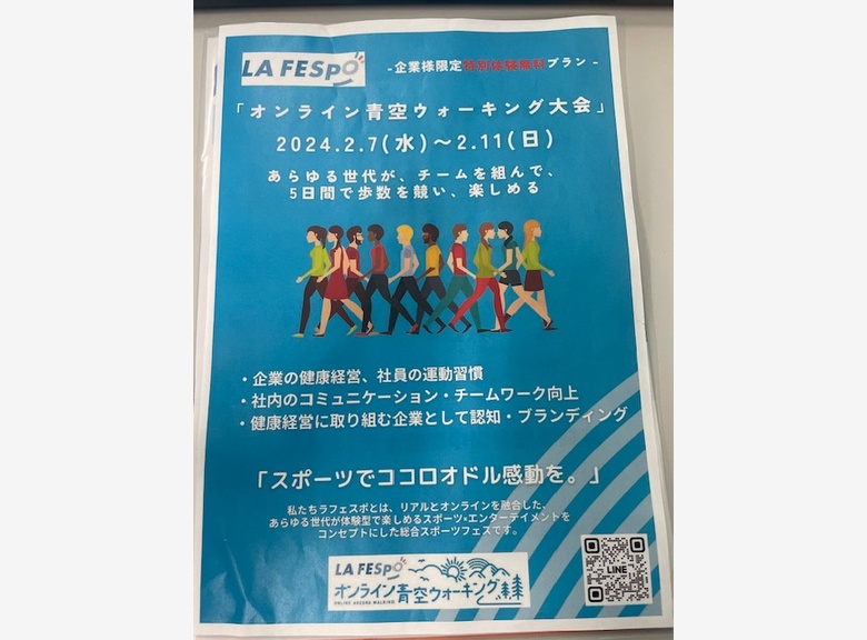 2/7~2/11の期間限定でオンライン上でのウォーキング大会に参加しました。8社からなる企業様と競い合いチーム戦で臨みました。チーム歩数合計で競い順位が決まります。また個別ランキングも発表されます。期間中チームランキングや個人ランキングもわかるのでとても楽しみながら取り組むことができました。気になる結果は・・・・
